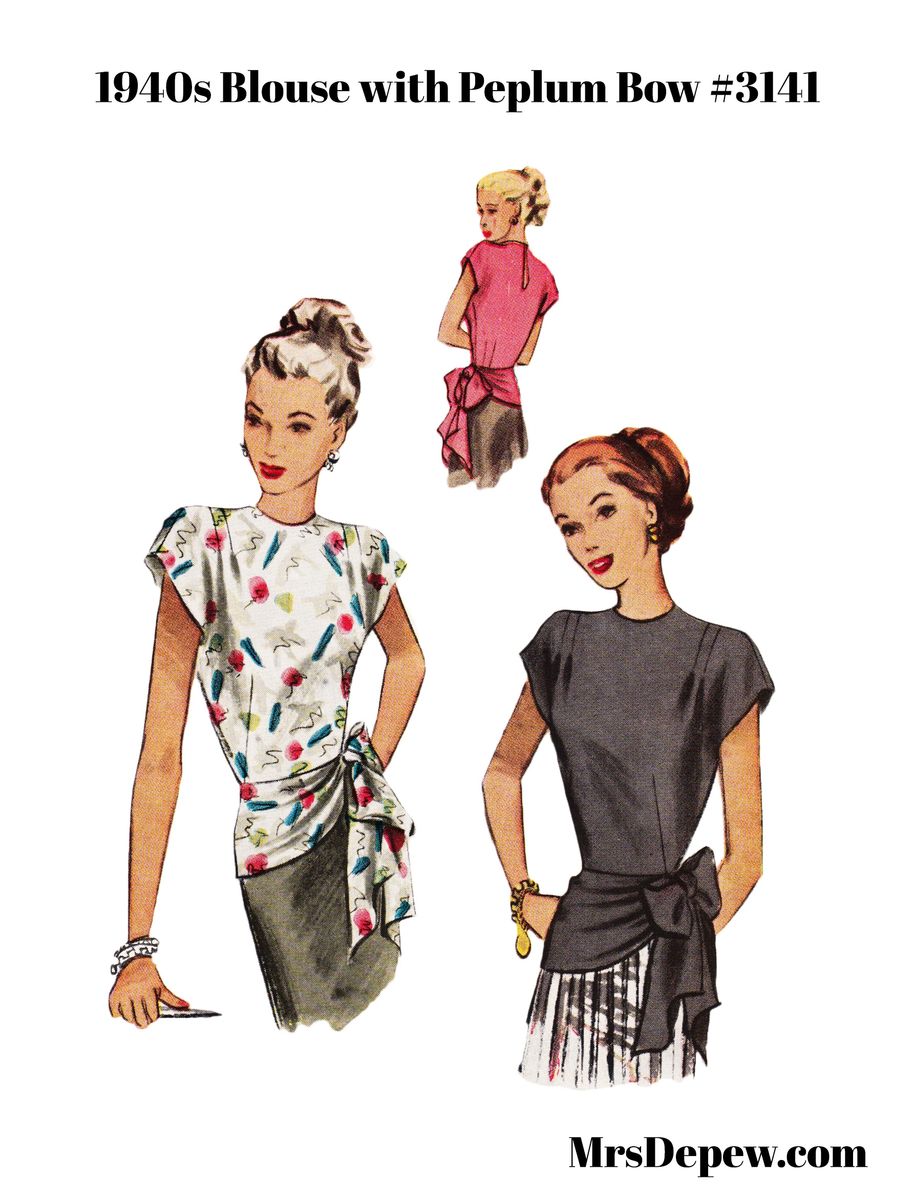 1940s Vintage Sewing Pattern Ladies Blouse With Peplum Bow 3141 Instant Download